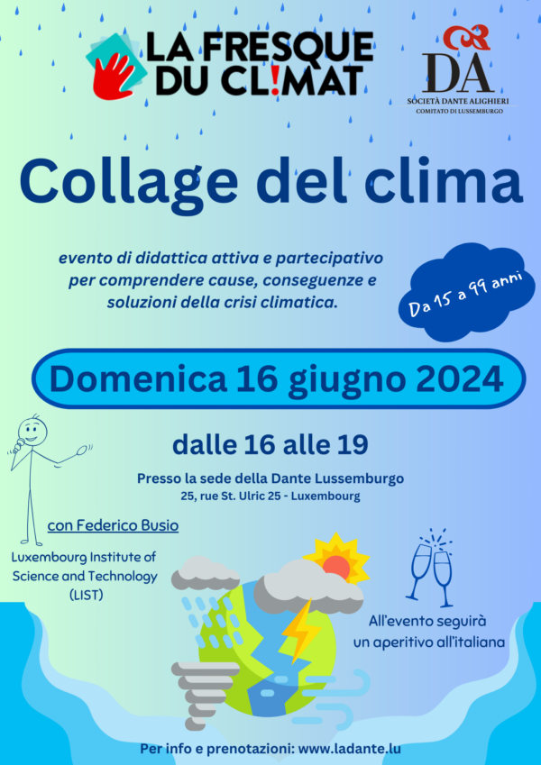 La Fresque du Climat (Collage del clima) è un evento di didattica attiva e partecipativo per comprendere cause, conseguenze e possibili soluzioni del fenomeno del riscaldamento del pianeta e dei cambiamenti climatici che ne conseguono. In modo ludico e interattivo i partecipanti alla Fresque du climat, riflettendo su concetti di scienze climatiche, comprenderanno quali siano le interazioni esistenti tra comportamenti e azioni dell’uomo e le ripercussioni sull’ambiente e sulla salute e qualità della vita umana.