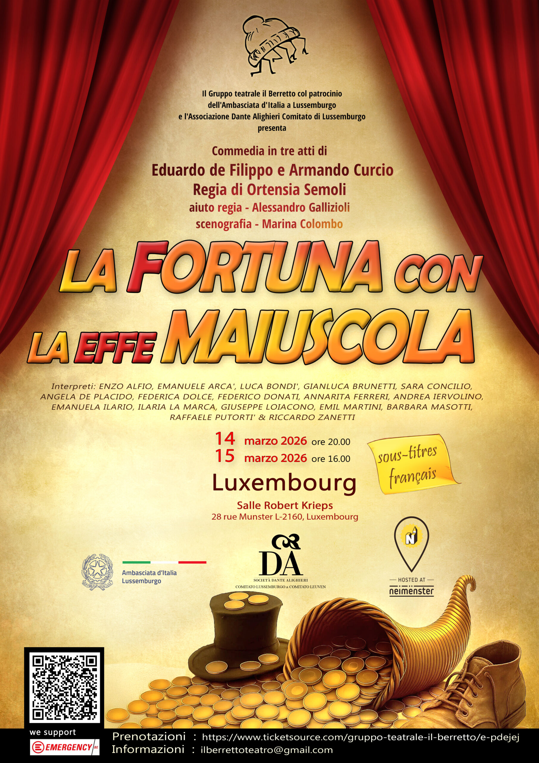 La comédie « La fortuna con la EFFE maiuscola » de Eduardo De Filippo et Armando Curcio est un drame comique captivant, situé dans le Naples de l’après-guerre. Avec humour et ironie, elle raconte la vie d’une famille modeste aux prises avec la misère, les malheurs et un héritage inattendu qui bouleversera leur destin.